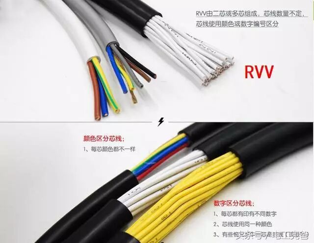 RVV铜芯聚氯乙烯绝缘聚氯乙烯护套连接软电线 。BVV由两芯或以上RV线组成线芯以不同颜色或数字编号区分。